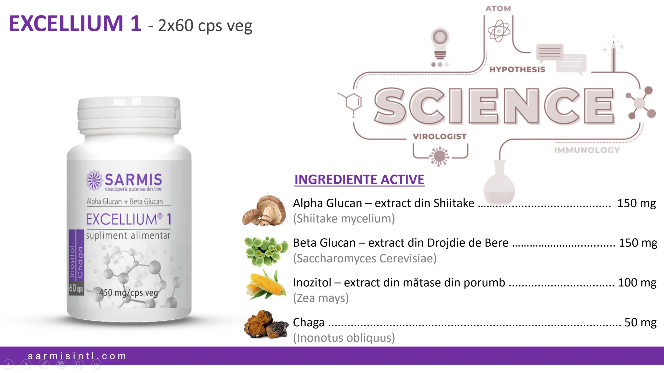 Pelin (Artemisia absinthium), Usturoi negru - fermentat (Allium sativum), Agaricus blazei muril - extract, Alpha Glucan - extract din Shiitake (Shiitake mycelium), Beta Glucan - extract din Drojdie de bere (Saccharomyces Cerevisiae), Chaga (Inonotus obliquus), Inozitol din matase de porumb, Ganoderma lucidum